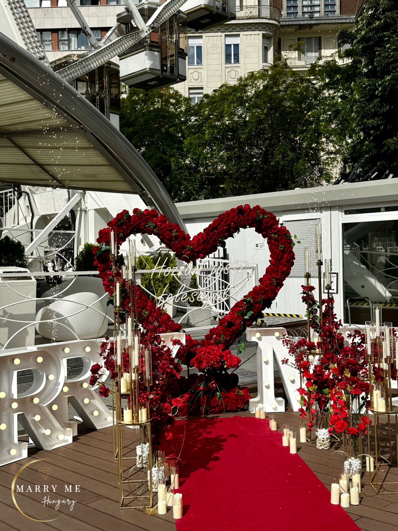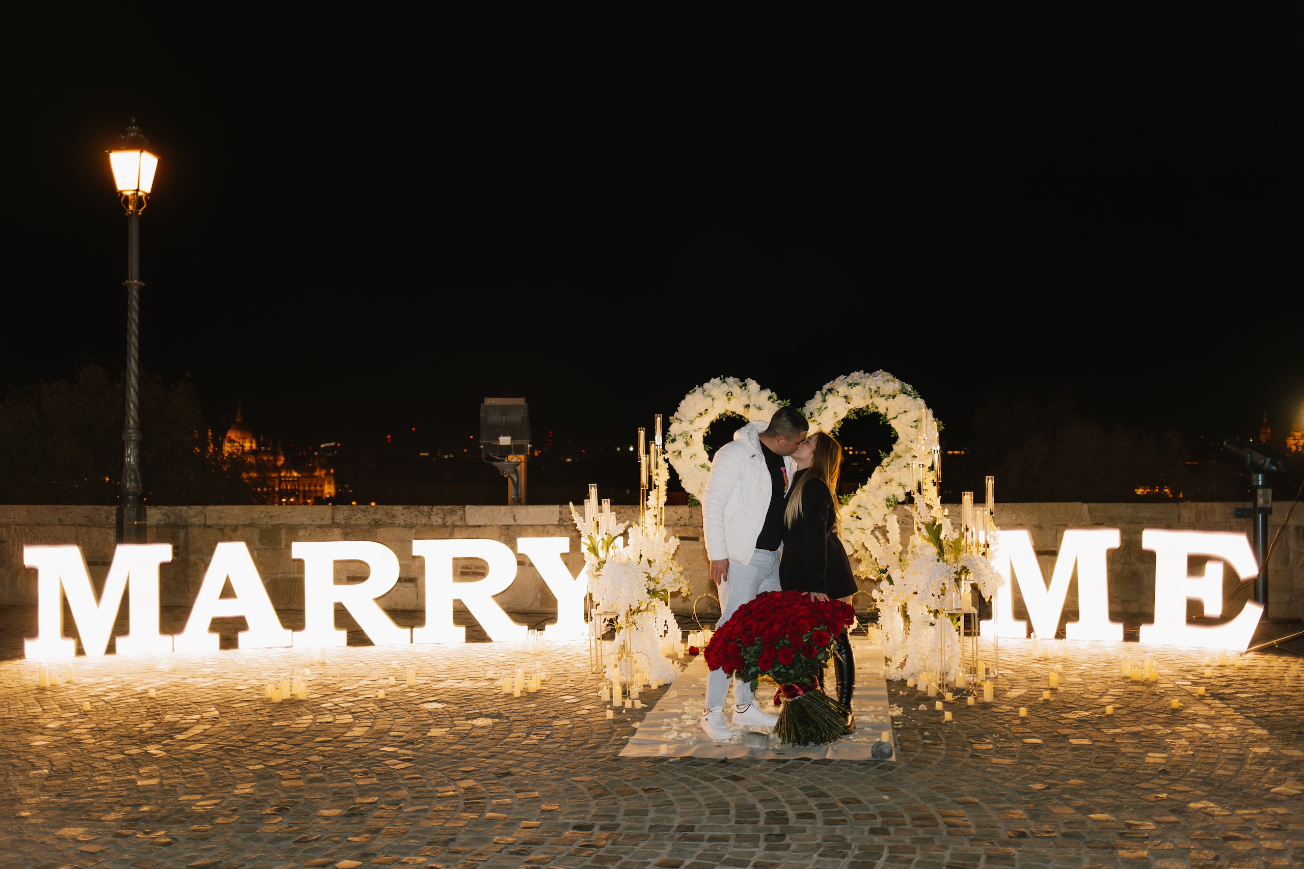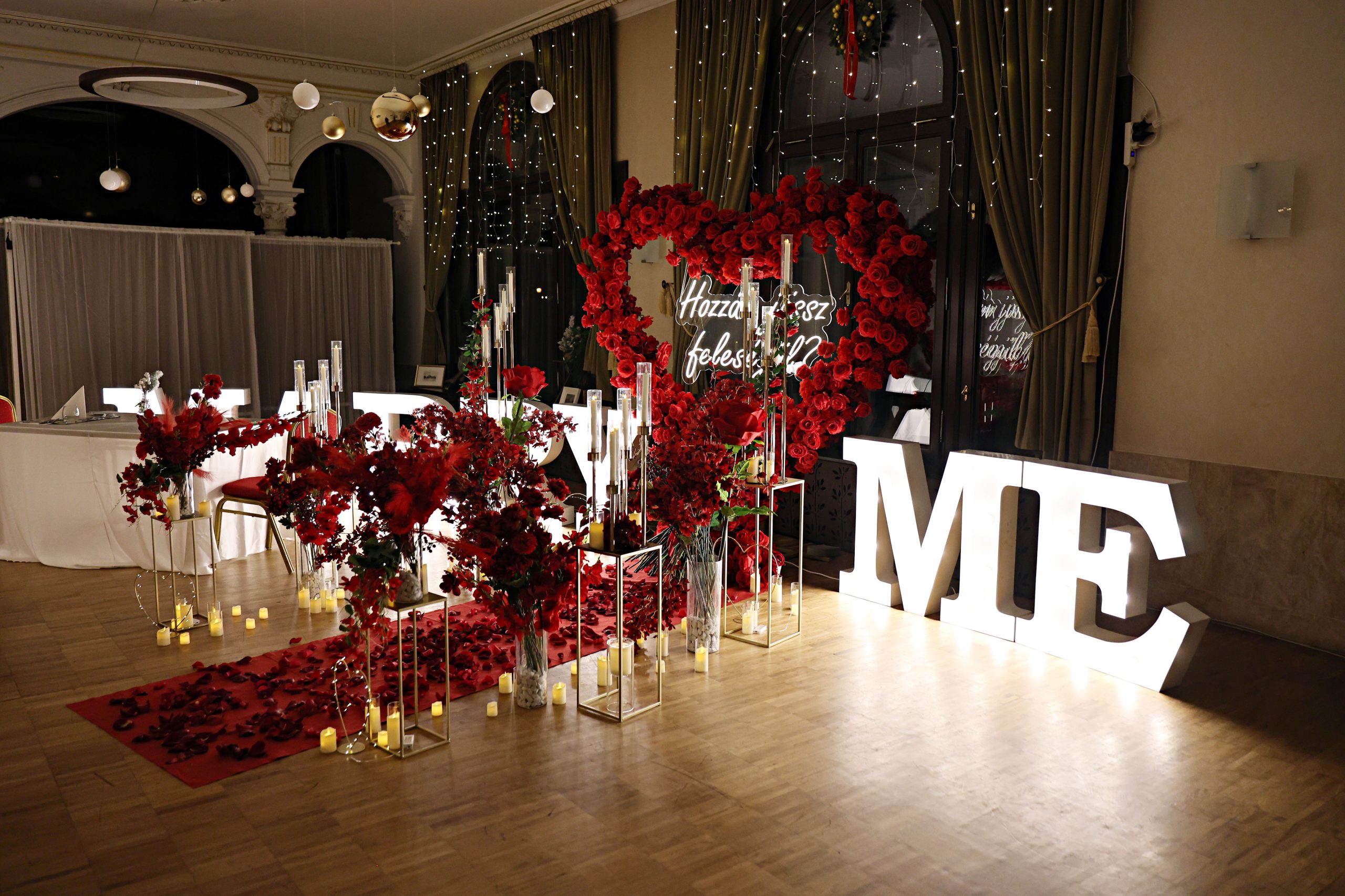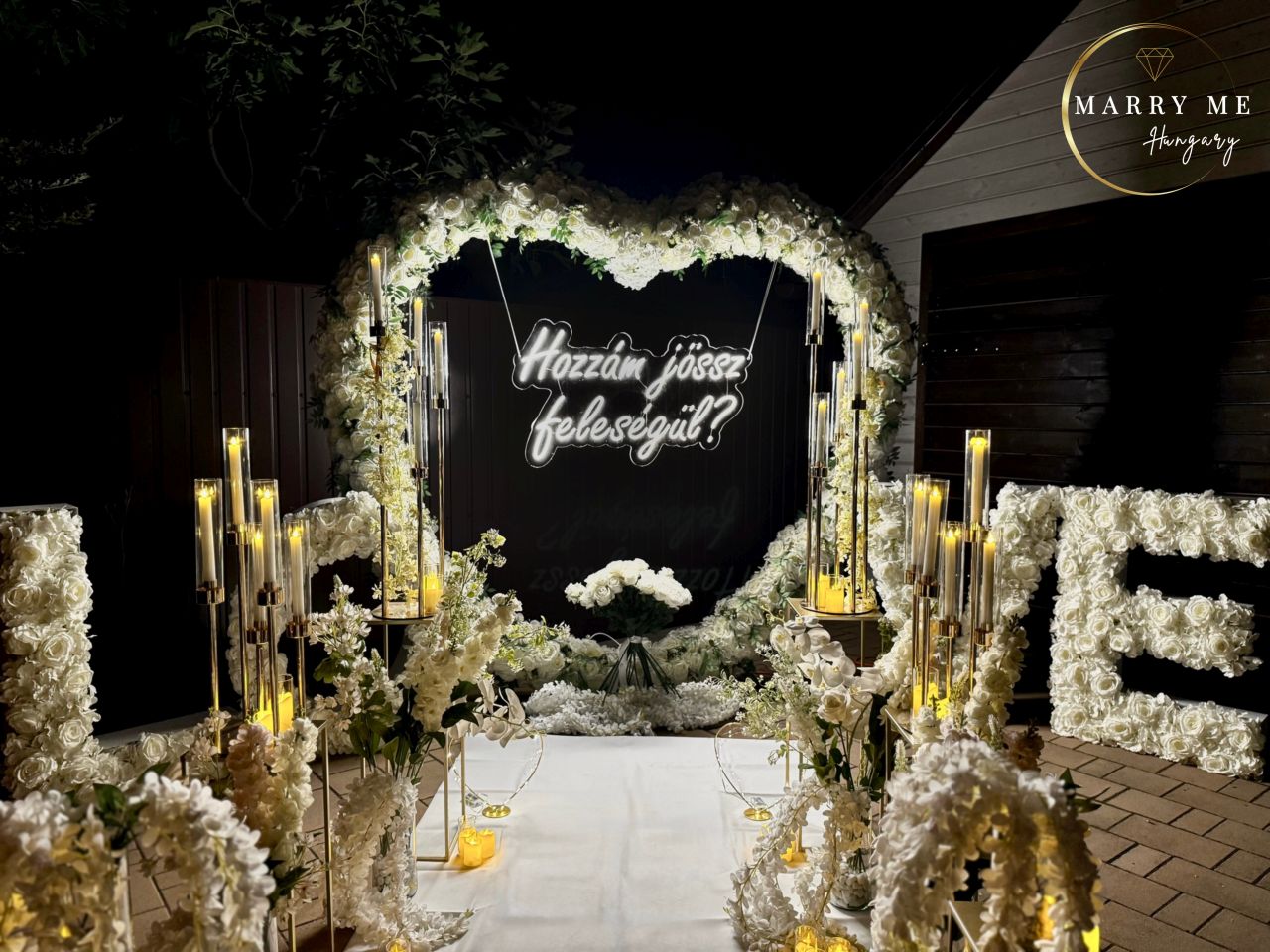 Az ikonikus „MARRY ME” világítós betűk vagy a romantikus „LOVE” virágos felirat ajándékba jár az Alap csomag mellé, hogy a nagy kérdés valóban felejthetetlen legyen.